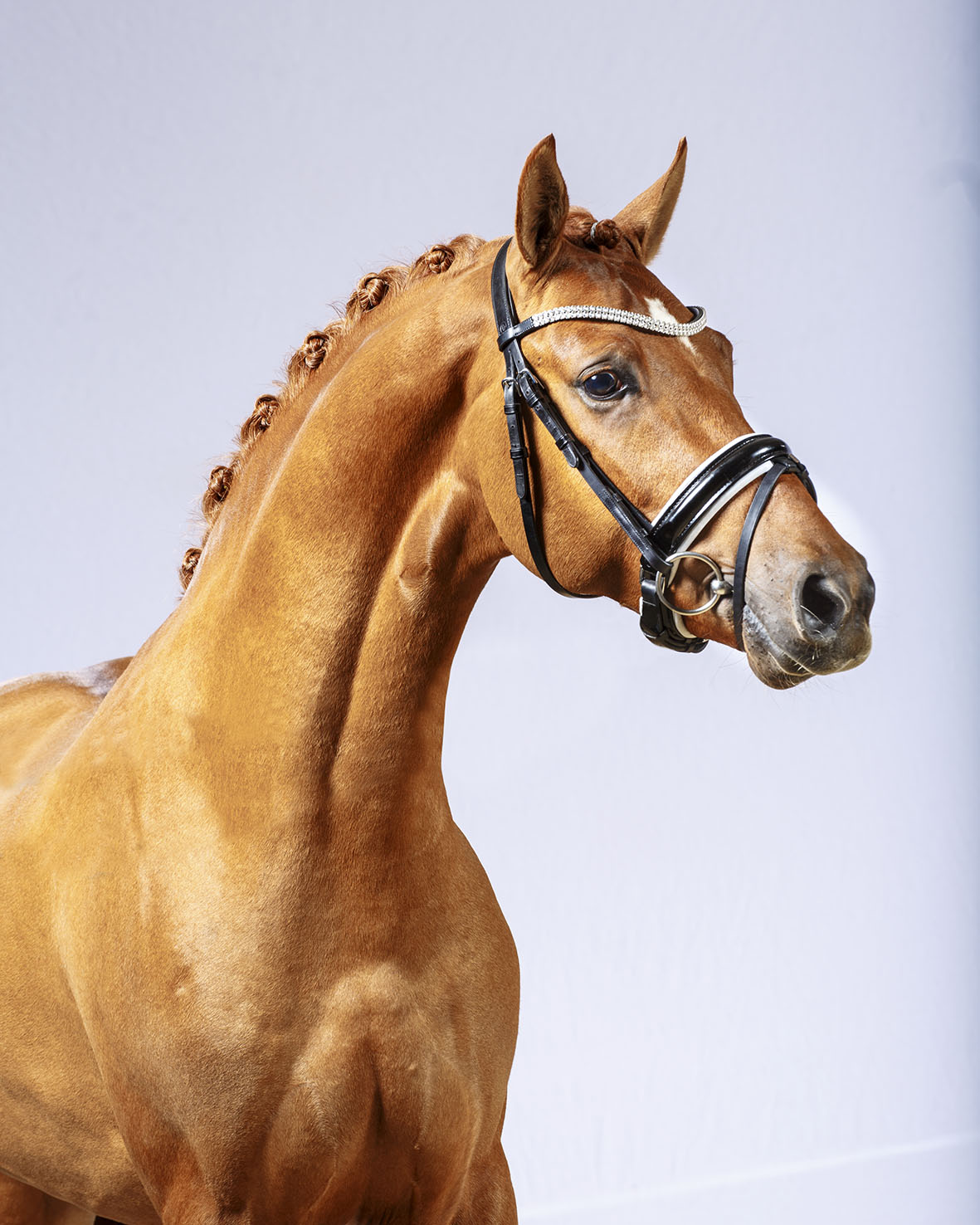 Der typvolle Fuchs von Dimension AT – Champus K verließ den Körplatz Vechta als 1. Reservesieger. Er überzeugte mit seinem Ausdruck, der Halsformation der Schultergröße und –lage. Durch seinen Körperbau ist er prädestiniert für einen dynamischen, raumgreifenden Trab, den er jederzeit in sehr gutem Takt präsentierte. Seine Galoppade immer sicher und bergauf, der Schritt taktsicher und fleißig.